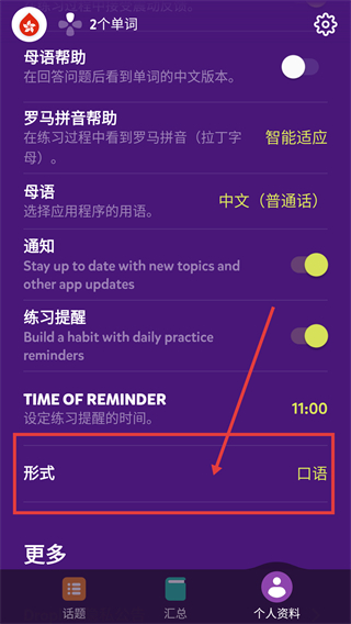 2、进入设置页后找到【形式】选项,当前显示为【口语】,点击它就能打开形式选择列表哦。