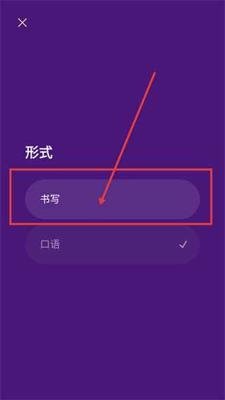 3、在形式选择列表里点击【书写】选项,就能将学习形式切换为书写模式,适配不同练习需求啦。
