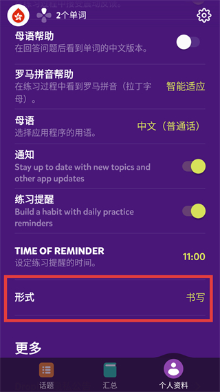 4、切换完成后返回设置页,能看到【形式】已变为【书写】,这样后续学习就会以书写形式进行啦。