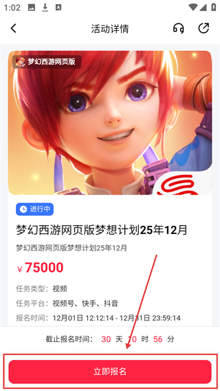 2、进入活动详情页后,确认任务类型和时间,点【立即报名】按钮就能参与该活动哦。