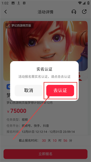 3、报名时会弹出实名认证提示,点【去认证】完成实名,才能继续参与活动的报名流程呀。