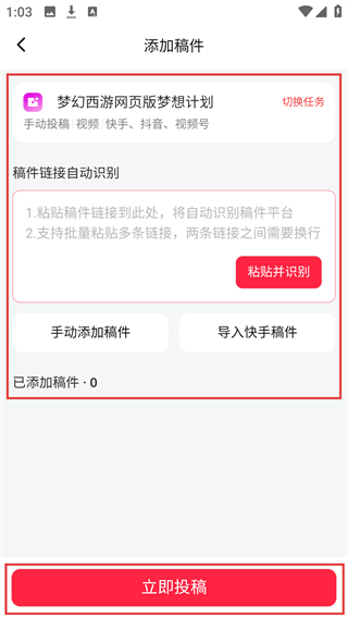4、认证后进入添加稿件页,粘贴作品链接并识别,之后点【立即投稿】就能提交作品参与活动啦。