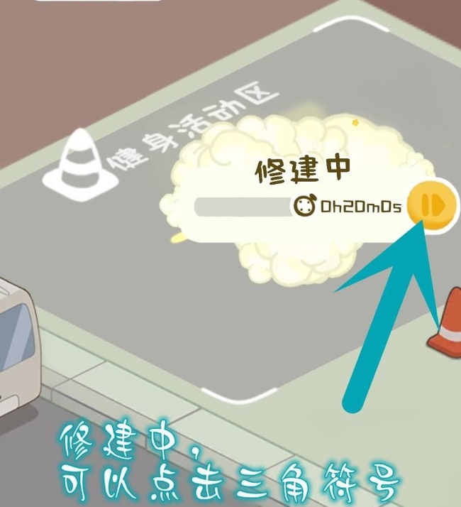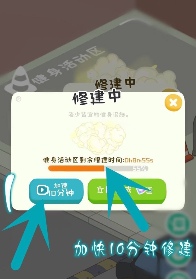 2、修建中,可以点击三角符号,点击看视频加速10分钟,看完视频已经加快10分钟修建,可以继续看视频加速,这样健身活动区就已经修建好。