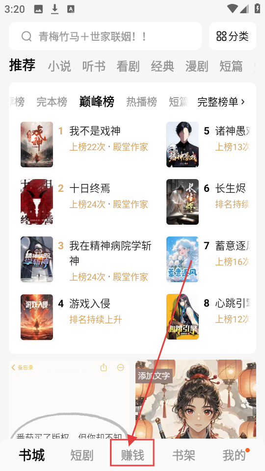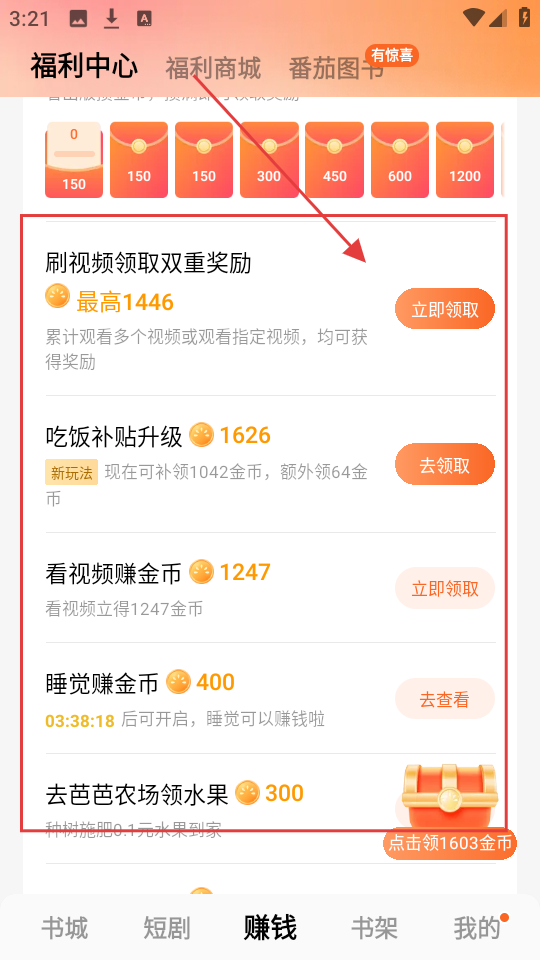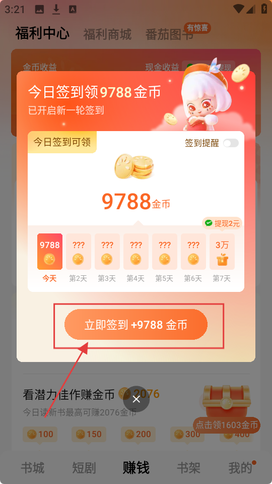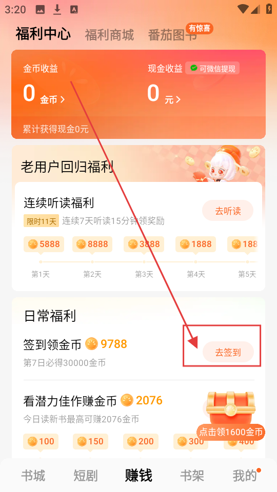1、在书城页面,点击底部【赚钱】按钮,就能进入福利中心,开启赚钱之旅啦,超期待的呢。