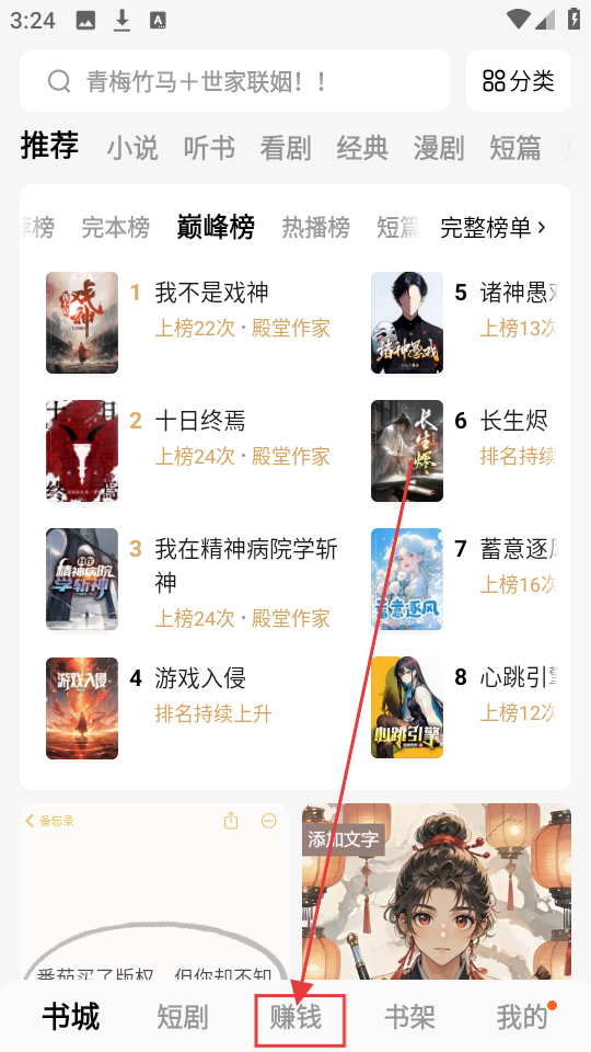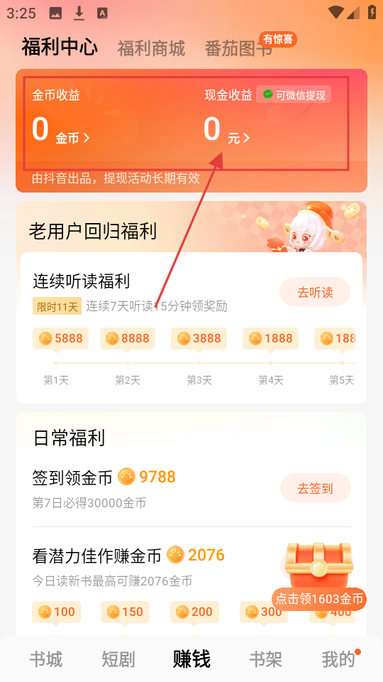 1、在书城页面,点击底部【赚钱】按钮,就能进入福利中心,开启赚收益的旅程啦。