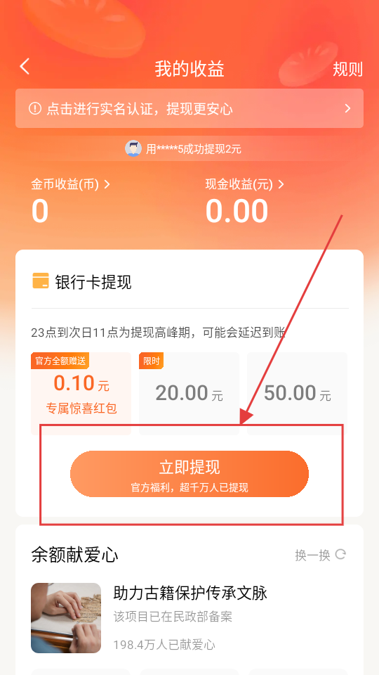 3、在【我的收益】页面,找到【立即提现】按钮,点击它,就能进入提现流程。