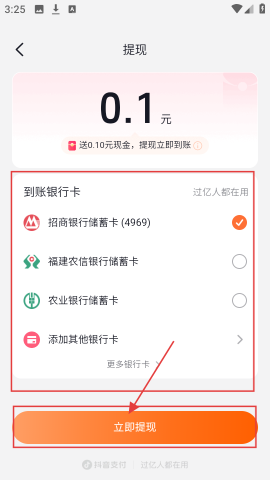 4、进入提现页面,选择到账银行卡,再点击【立即提现】,就能把收益提现啦。