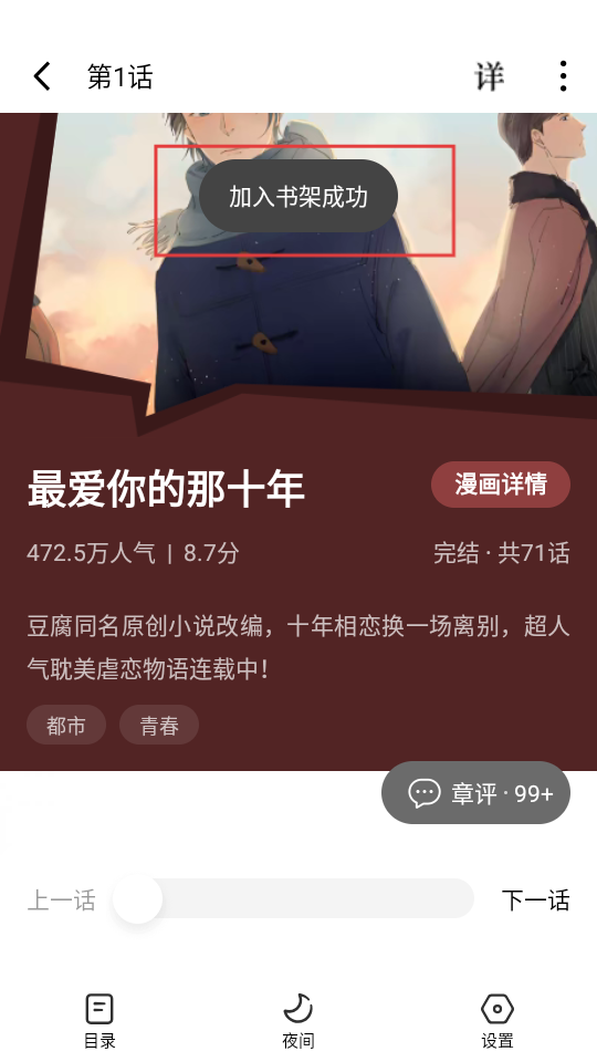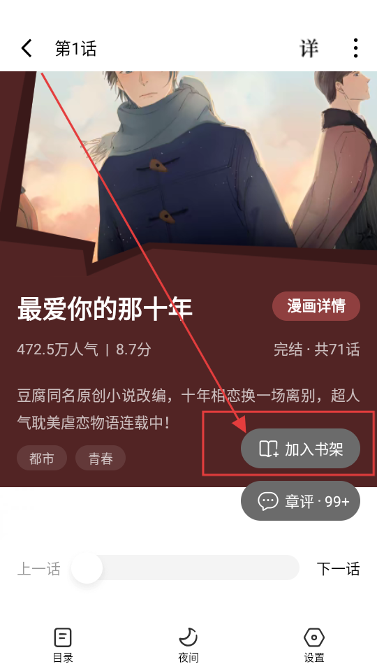 1、在漫画阅读界面,看到【加入书架】按钮,点击它就能把喜欢的漫画加入书架,方便后续查看啦。