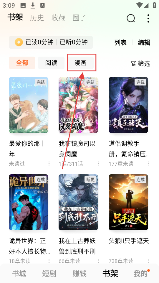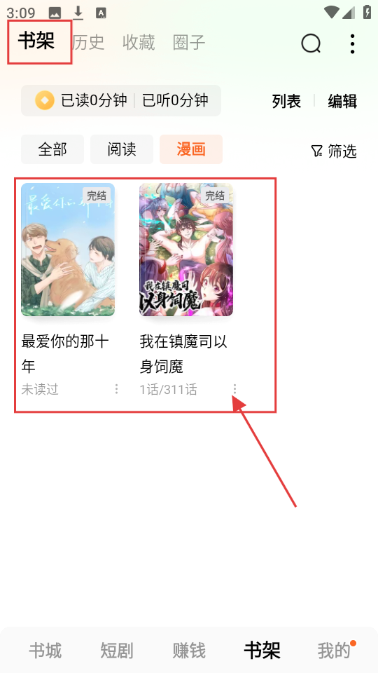 3、进入书架页面,点击【漫画】标签,就能看到所有加入书架的漫画,找起来超方便的哟。