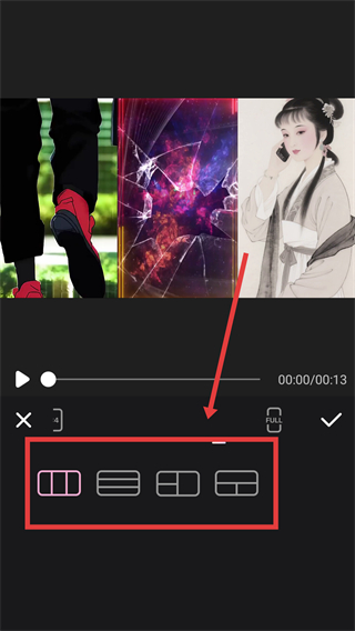 3、在模板选择界面挑选心仪的布局模板,选中后就能应用到当前拼接的视频中,让排版更美观哦。