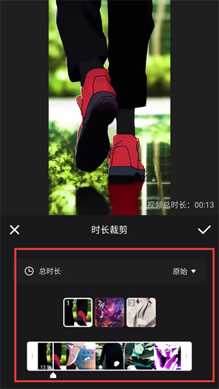4、点击【时长裁剪】选项,进入时长调整界面,可修改各段视频的时长,让拼接节奏更流畅哦。