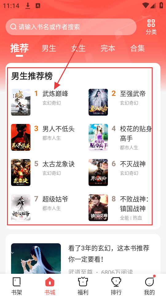 1、在书城推荐板块的男生推荐榜里,有热门小说如【武炼巅峰】,点击它可进入详情页,开启阅读之旅哦。