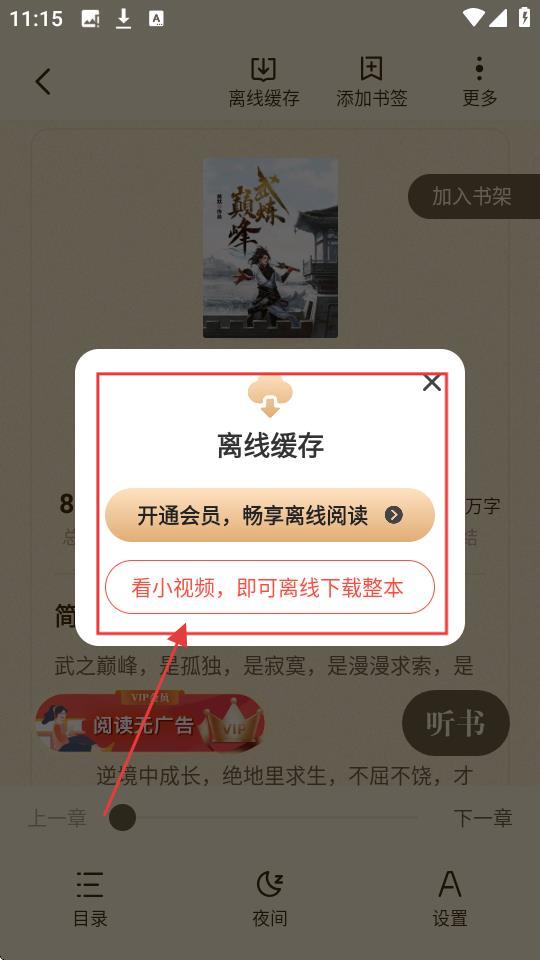 2、进入小说详情页后,顶部有【离线缓存】按钮,点击它可开启离线缓存流程,方便离线阅读啦。