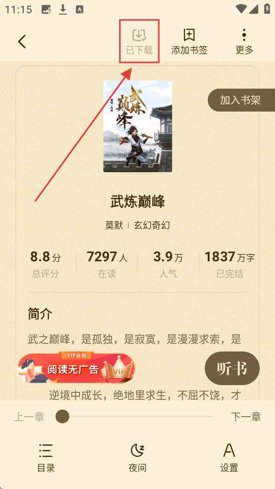 4、完成离线缓存后,页面顶部的【离线缓存】按钮会显示【已下载】,说明小说已成功缓存,可离线阅读啦。