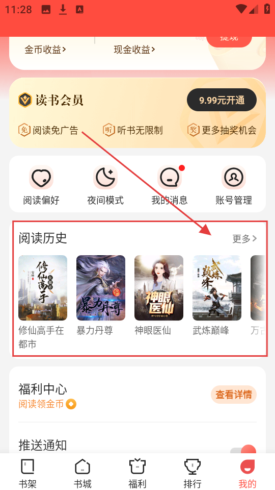 1、在“我的”页面,找到【阅读历史】板块,点击【更多】可查看完整的阅读历史列表哦。