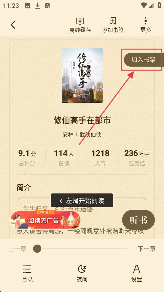 2、在小说详情页,点击【加入书架】按钮,将小说加入书架哦。