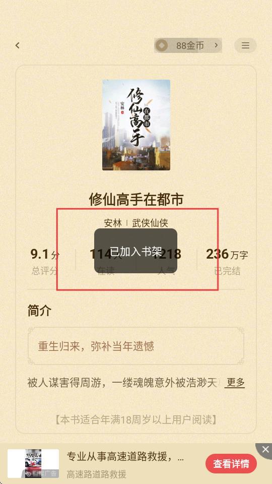 3、点击后,页面显示【已加入书架】提示,说明小说成功加入书架呢。