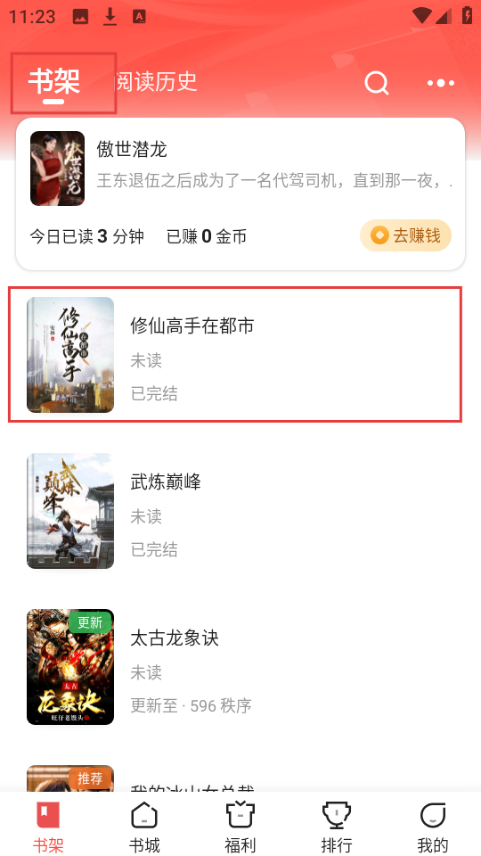 4、进入书架页面,即可看到【修仙高手在都市】已在书架列表中,方便后续阅读啦。