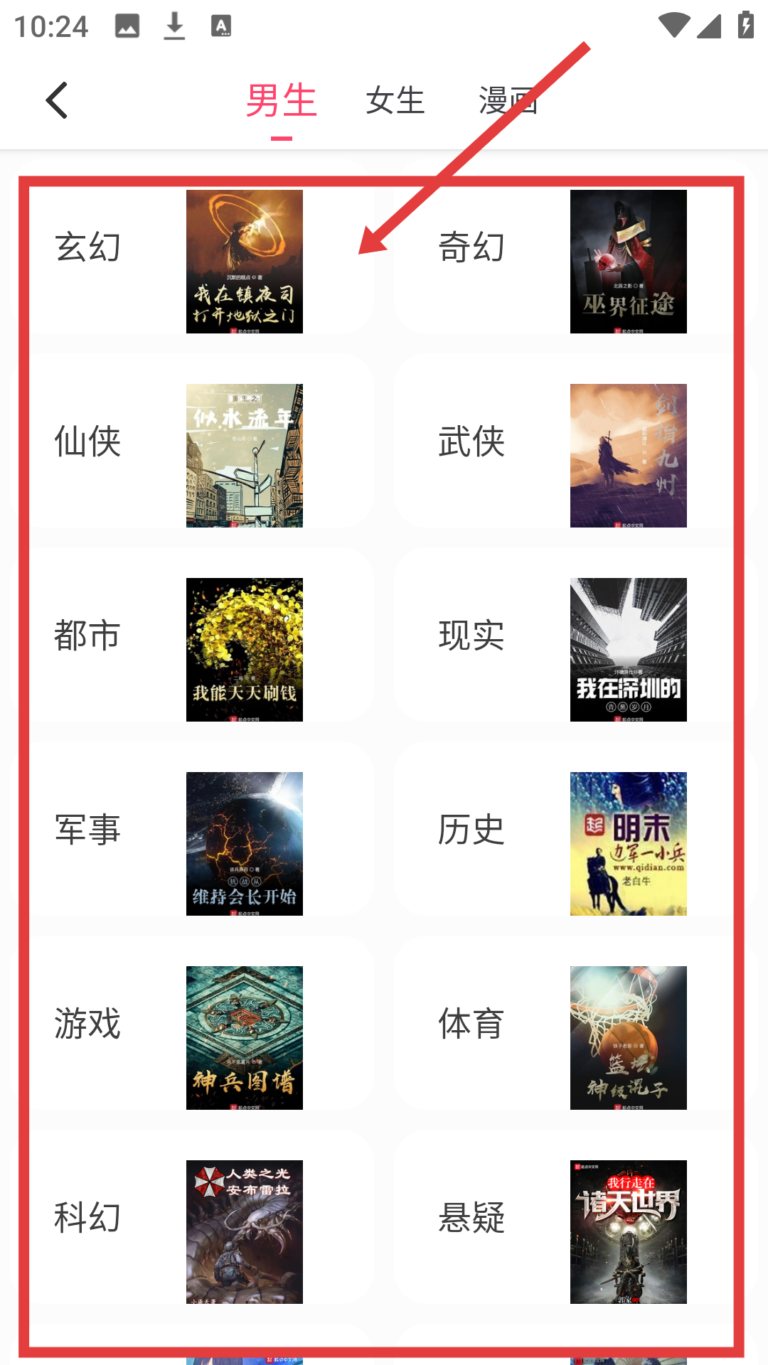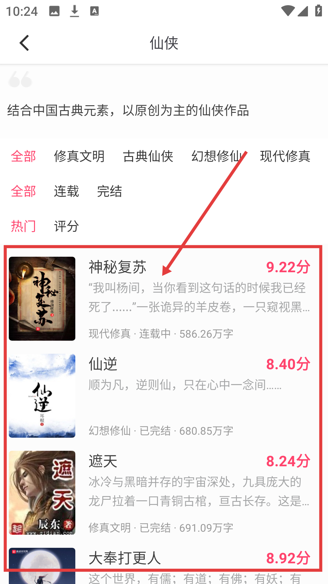 2、在分类界面挑选喜欢的小说类别,如【仙侠】,点击即可进入该类别小说列表啦。