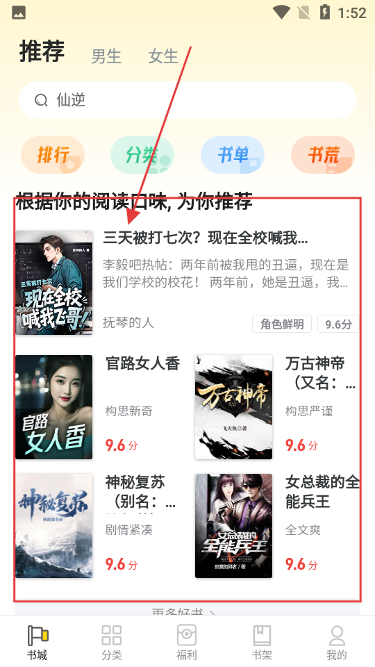 1、我们进入小说软件,能看到推荐的小说列表,若对某本小说感兴趣,点击小说封面或标题吧。