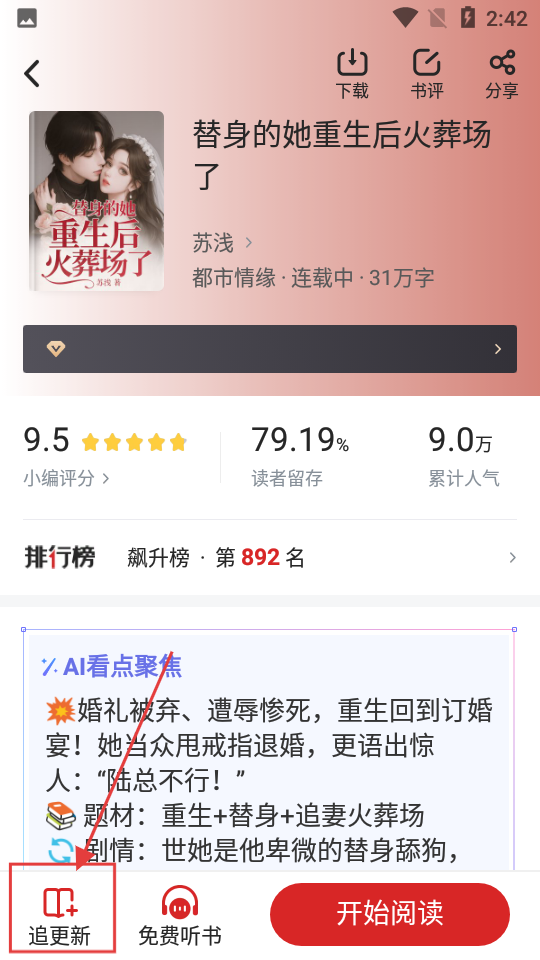 1、打开APP书城页面,在推荐小说里选《替身的她重生后火葬场了》,进入小说详情页面,准备设置追更啦。
