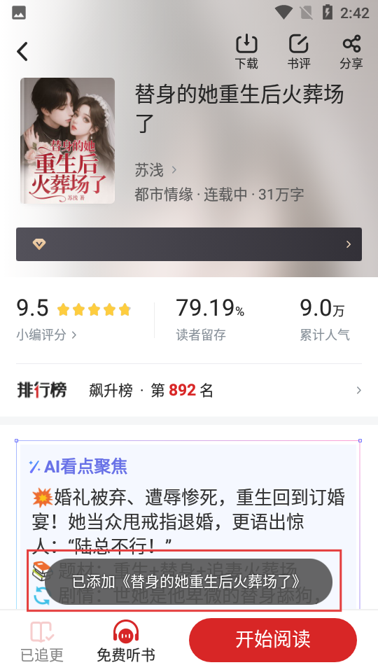 3、点击后,页面会提示“已添加《替身的她重生后火葬场了》”,说明追更设置成功,后续有更新能及时知晓呢。