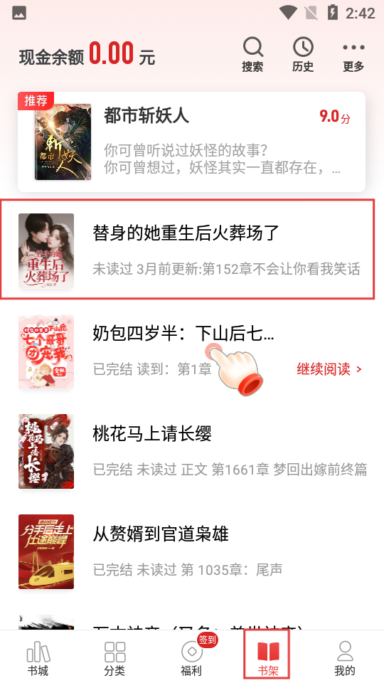 4、进入【书架】页面,能看到已添加追更的《替身的她重生后火葬场了》,方便查看小说更新等情况啦。