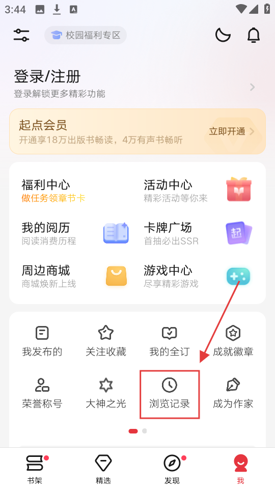 2、进入“我”的页面后,找到【浏览记录】选项,点击它就能查看之前浏览过的书籍啦,超方便的。