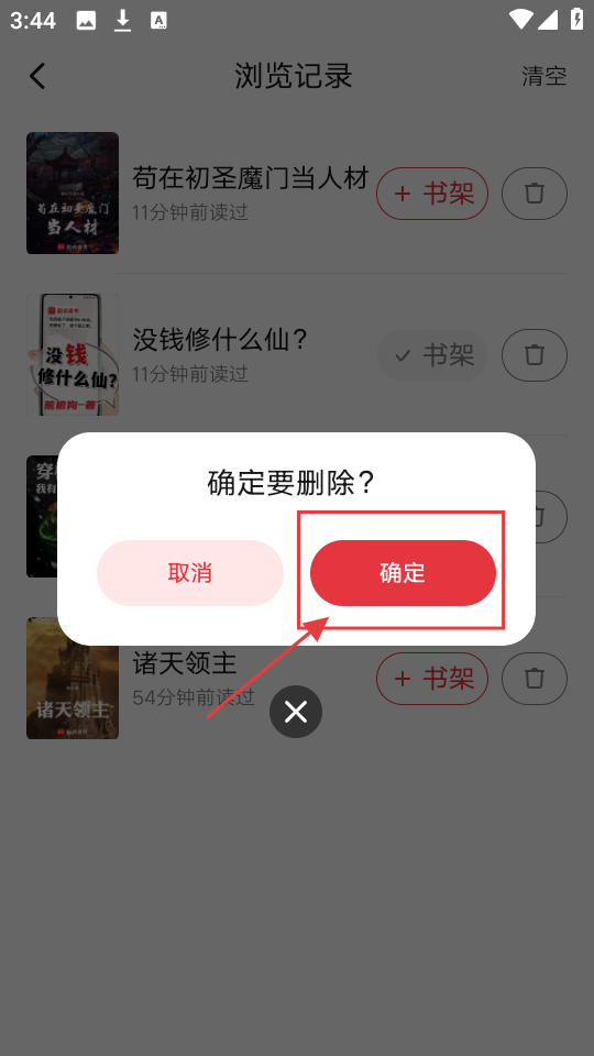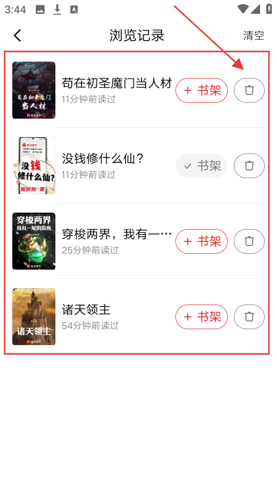 3、在浏览记录页面,能看到之前看过的书籍,若想删除某条记录,点击书籍旁的垃圾桶图标就行啦。