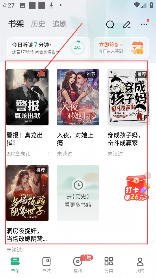 1、在书架页面,能看到已添加的小说,找到想读的,点击封面就能进入阅读页面啦。