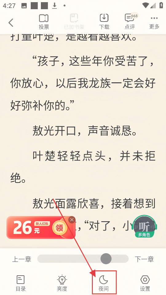 2、在小说阅读页面,点击底部【夜间】,能切换到夜间模式,阅读更护眼。