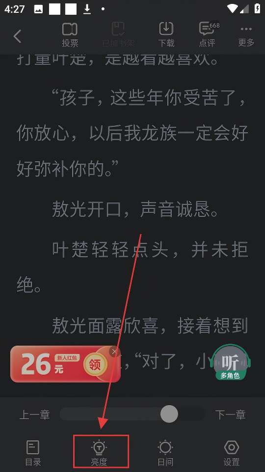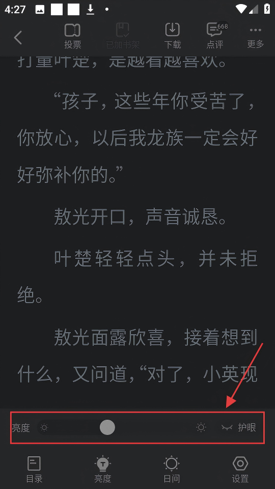 3、切换到夜间模式后,点击【亮度】,可调整屏幕亮度,让阅读更舒适。