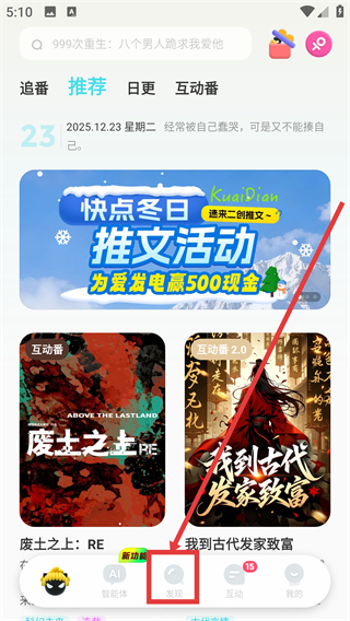 1、点击底部的【发现】按钮,点击它就能进入分类页面,轻松找到喜欢的内容啦,快试试吧!