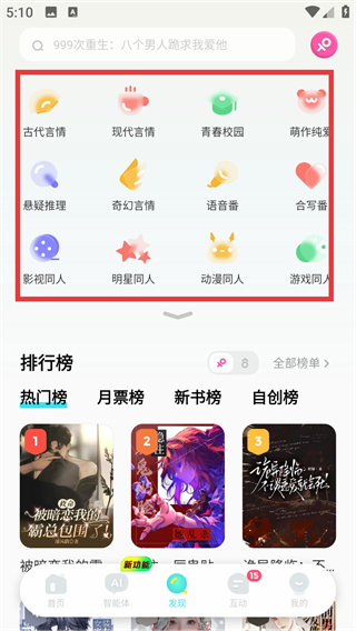 2、进入【发现】页后,能看到【古代言情】【青春校园】等分类标签,选择你感兴趣的标签就能筛选内容哦!
