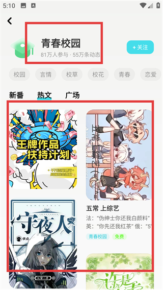 3、点击【青春校园】分类后,就能看到对应的作品列表,像《五常上综艺》这类作品都在这儿,超方便找!
