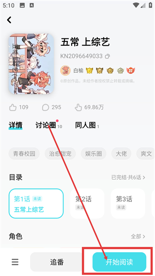 4、进入《五常上综艺》详情页后,点击底部的【开始阅读】按钮,就能直接开启这部作品的阅读之旅啦!