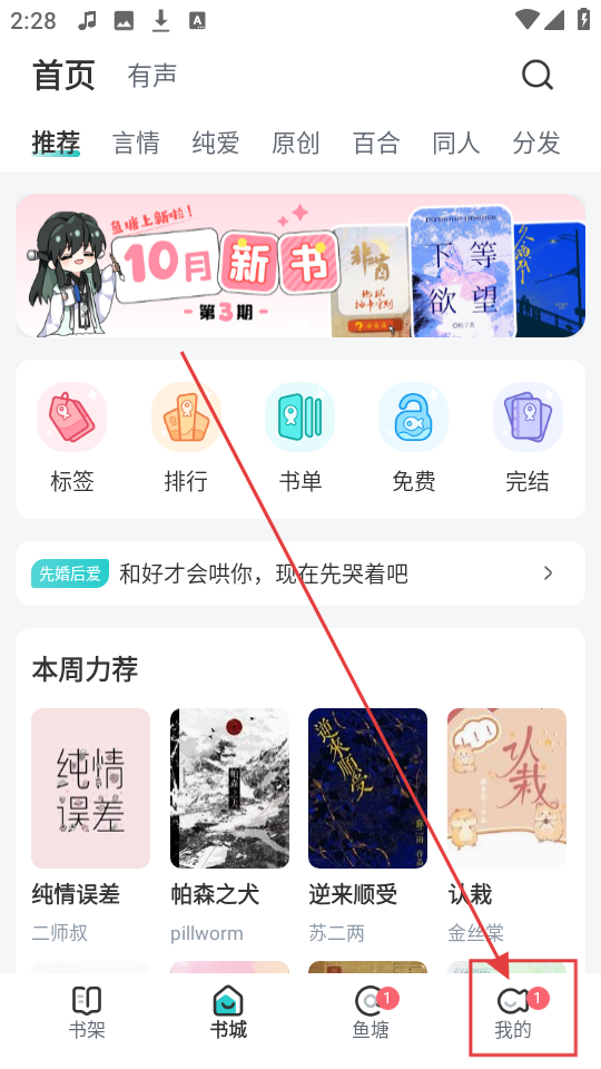 1、打开长佩阅读APP首页,点击右下角【我的】,进入个人中心页面,准备申请成为作者啦。