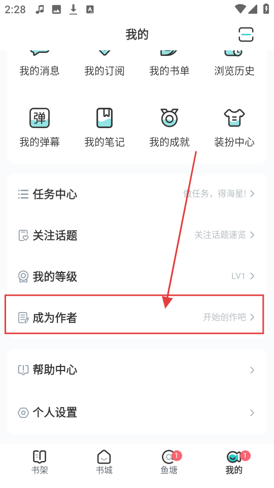 2、在个人中心页面,找到【成为作者】选项并点击,进入成为作者的相关页面,查看注册须知哦。