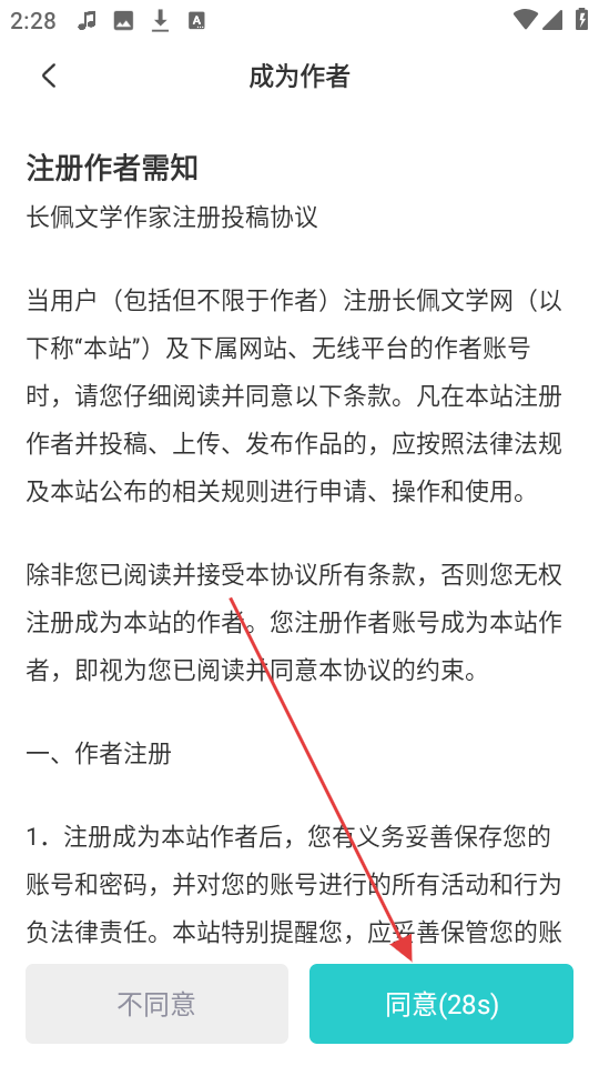 3、在成为作者页面,仔细阅读注册作者需知,待倒计时结束后,点击【同意】按钮,接受投稿协议呢。
