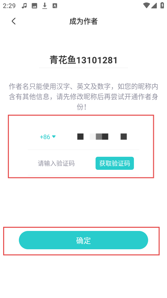 4、按要求填写手机号,获取并输入验证码,点击【确定】按钮,完成作者身份开通,即可开始写小说啦。