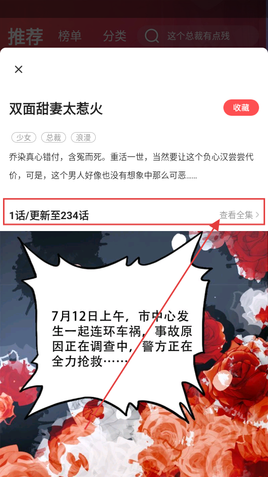 2、进入漫画详情,看到【1话/更新至234话】,点击【查看全集】就能浏览所有章节啦。