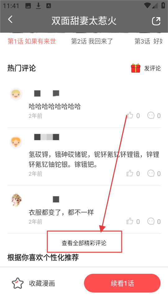 3、看漫画时,想了解大家的看法,就点击【查看全部精彩评论】,看看其他读者的有趣评论哦。