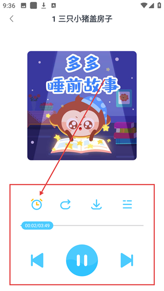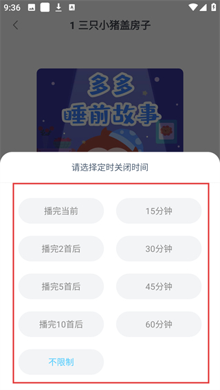 3、在故事播放页,点定时按钮可设置自动关闭时间,适合睡前听故事时避免播放太久哦。