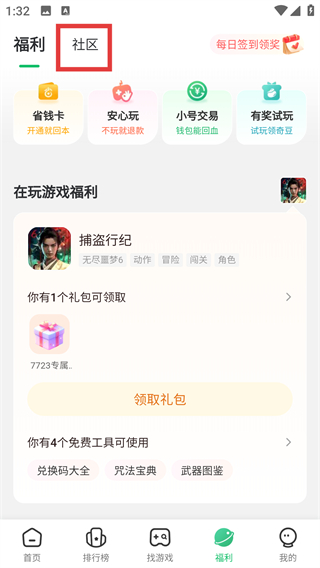 1、在福利页面点顶部的【社区】选项,能切换到社区界面,后续可参与板块互动或发布内容啦。