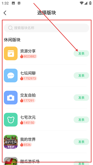 3、在选择板块页找到目标板块,点对应的【发表】按钮,就能进入该板块的内容编辑界面啦。