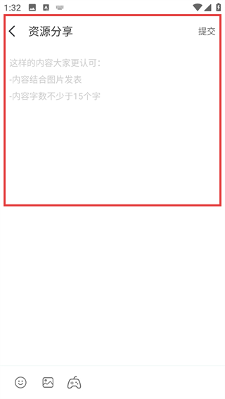 4、进入资源分享编辑页后,按提示编辑内容,满足字数和配图要求后点【提交】就能发布啦。