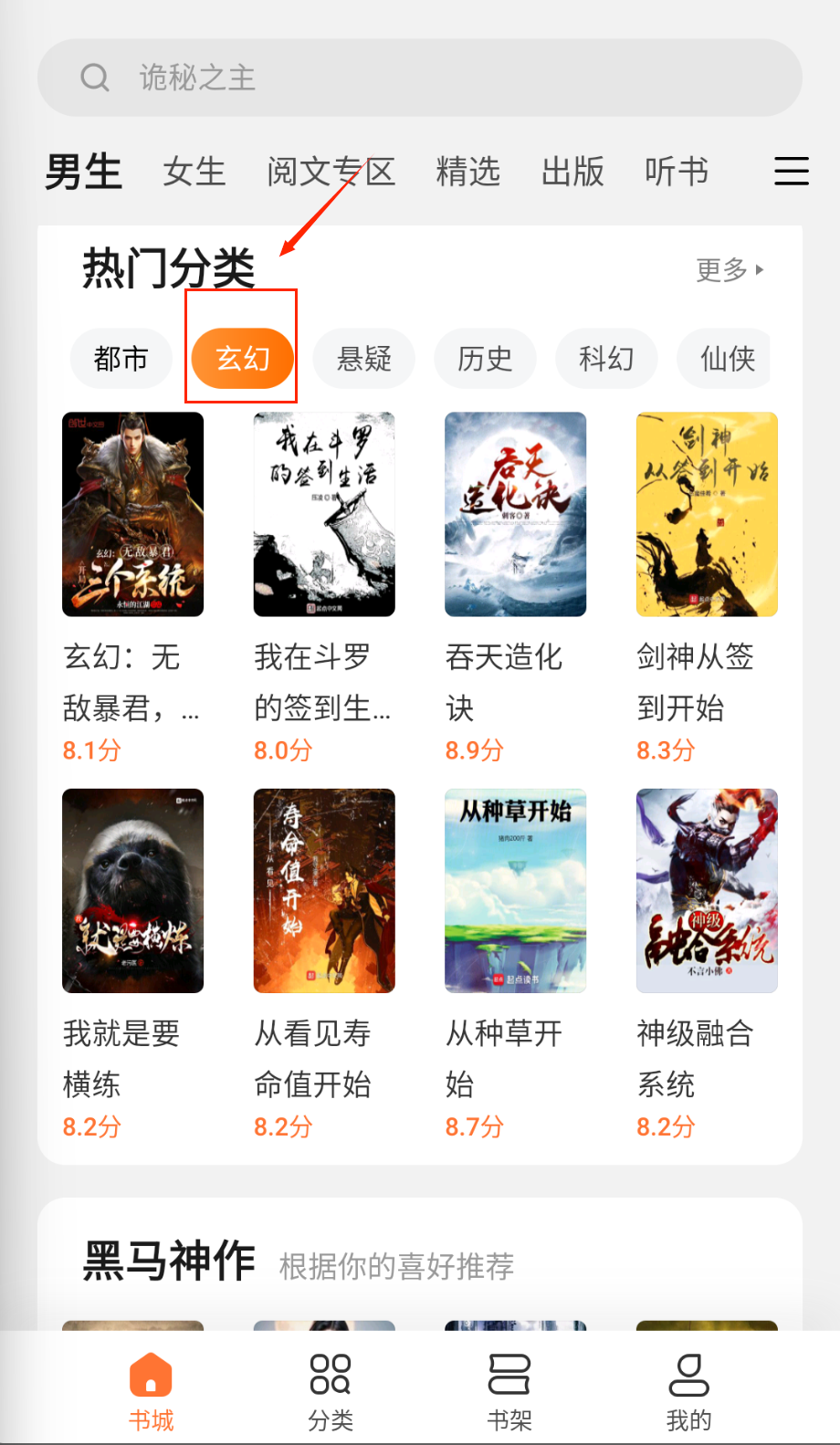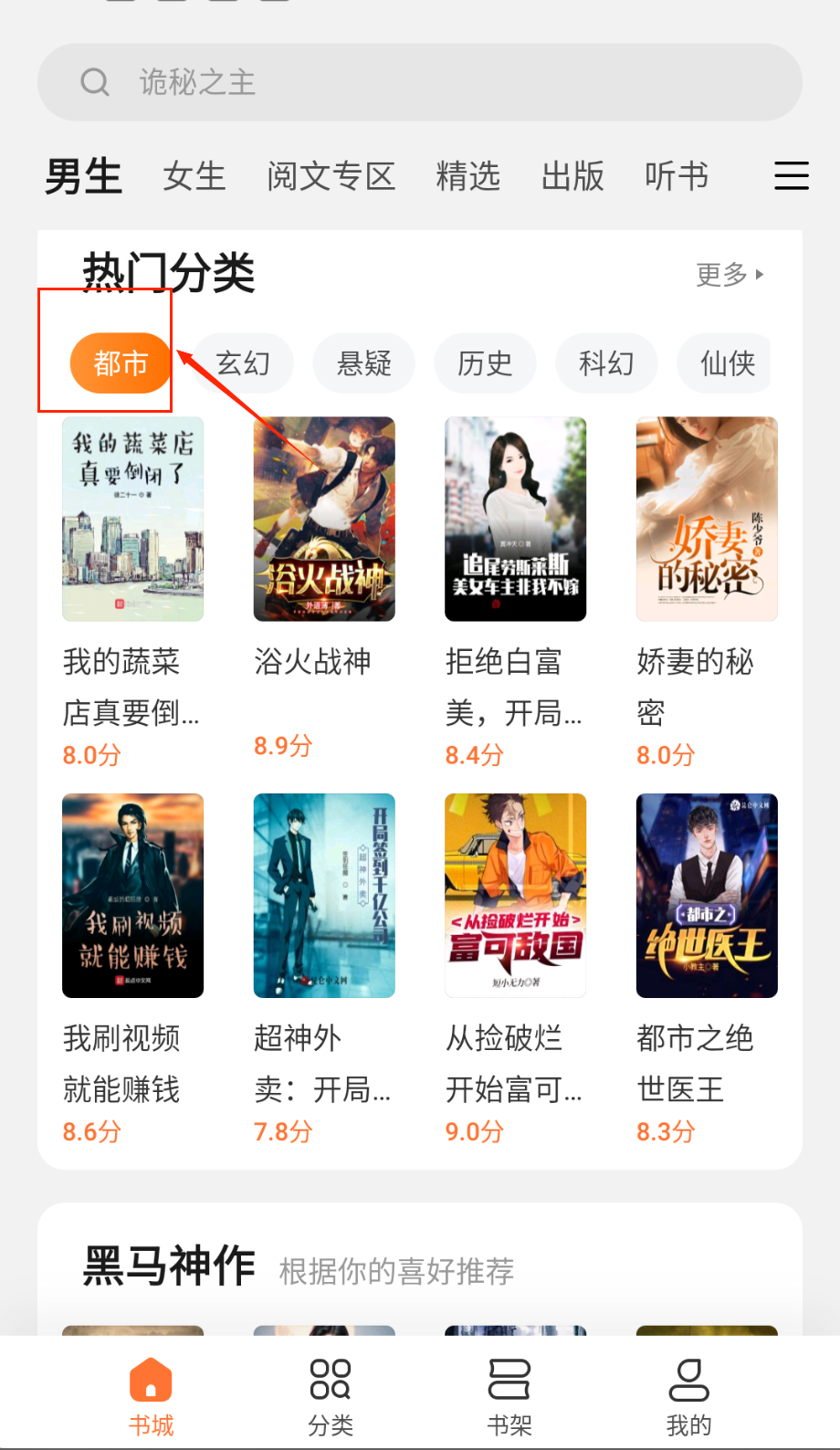 2、"按热门分类"区域展示都市、玄幻、历史等十多个分类,每个分类都有代表性作品封面辅助选择。