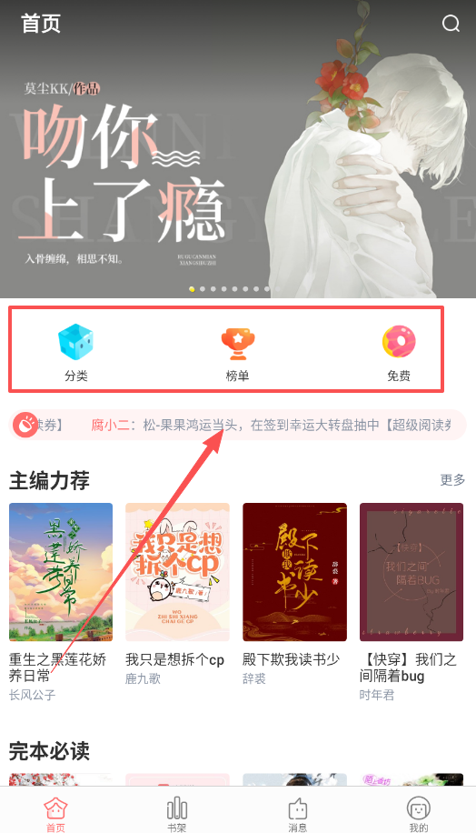 1、首先呢,在主界面底部导航栏选择“首页”,就能看到主编力荐和完本必读等小说推荐板块,方便你快速发现热门作品。