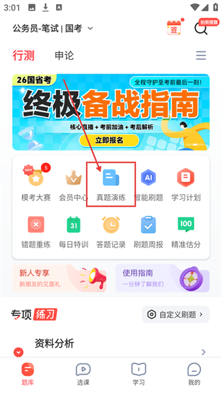 1、进入公考备考主界面后,点击【真题演练】选项,就能进入真题练习的专属页面啦。