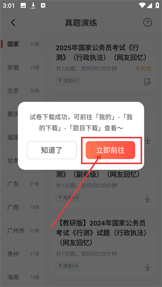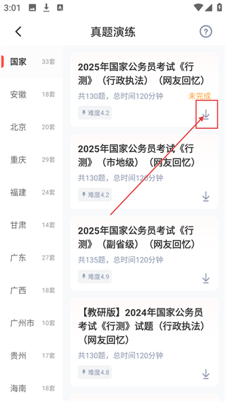 2、在真题演练页选择目标试卷,点击对应的下载按钮,就能开始下载该套真题试卷哦。